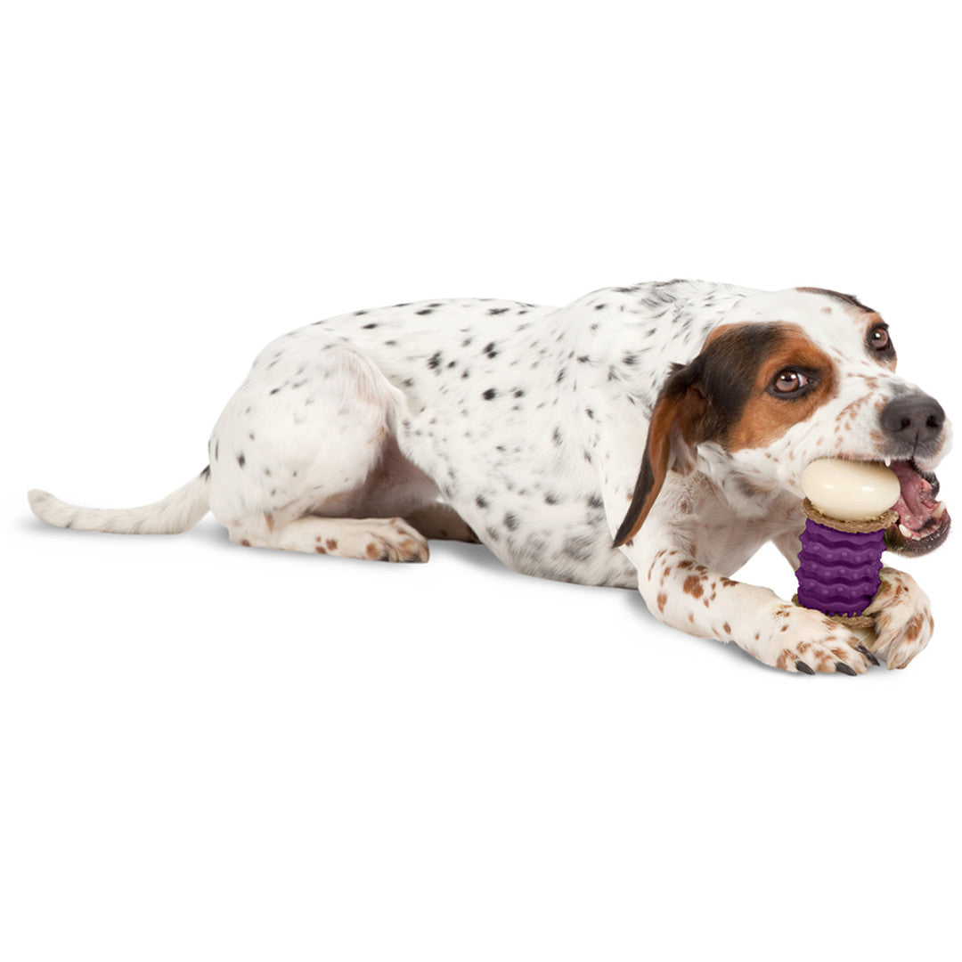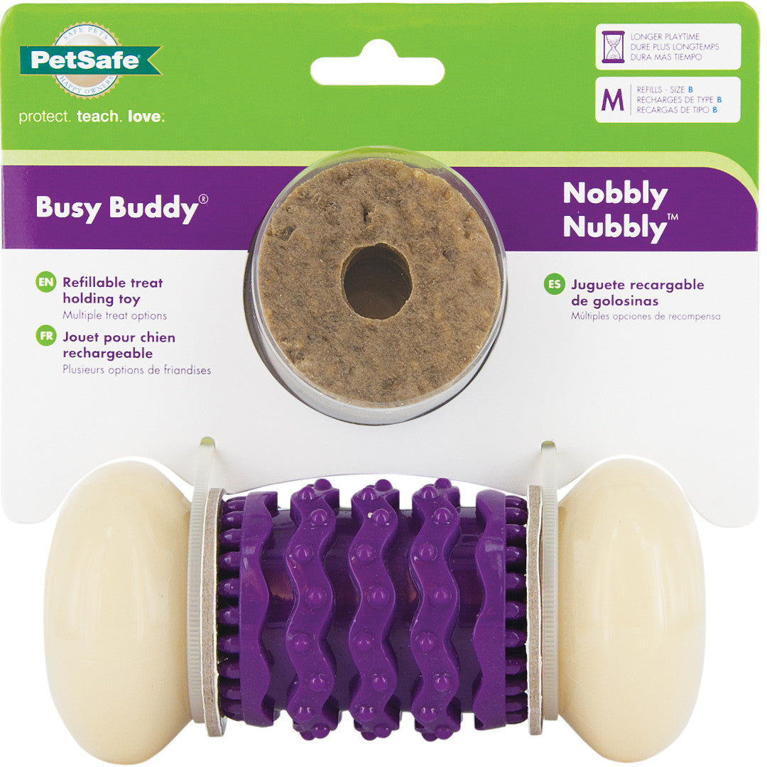 The durable nylon and rubber Nobbly Nubbly™ toy gives your dog multiple treat options for longer lasting playtime. Use with Busy Buddy® treat rings or fill the grooves with your dog's favourite spreadable treat, such as peanut butter or cheese. Perfect for dogs who like to chew, the toy rewards your dog for appropriate chewing. To add treat rings, unscrew the ends and remove the purple center section. Slide a ring on both ends of the purple center section. Screw the ends back together and let the fun begin! For more variety, fill the grooves on the center section with your dog's favourite smearable treat.