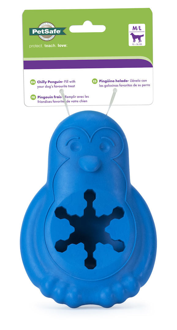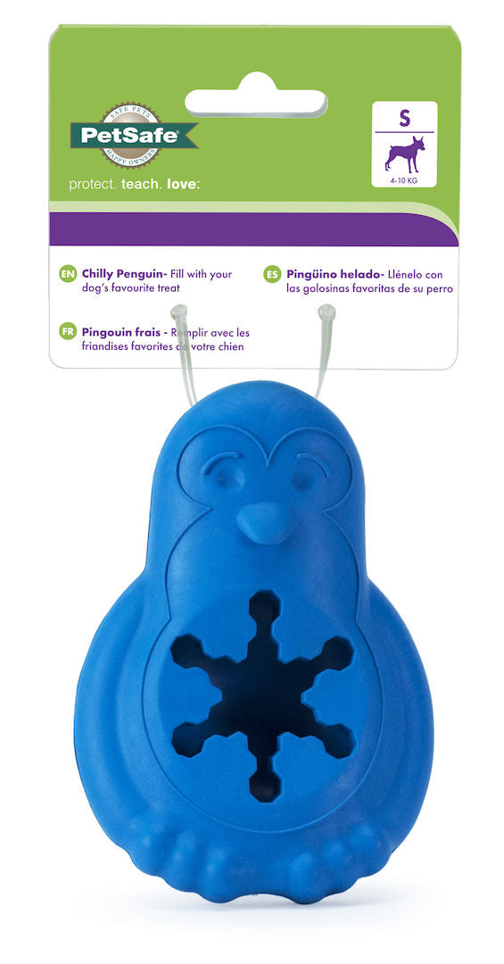 The Chilly Penguin Freezer Toy is a treat holding toy with a bowl shaped cavity for ice and treats. Multiple penguins can be stacked on top of one another in the freezer for easy storage before playtime. The toy will extend playtime and act as a fun treat for your dog!