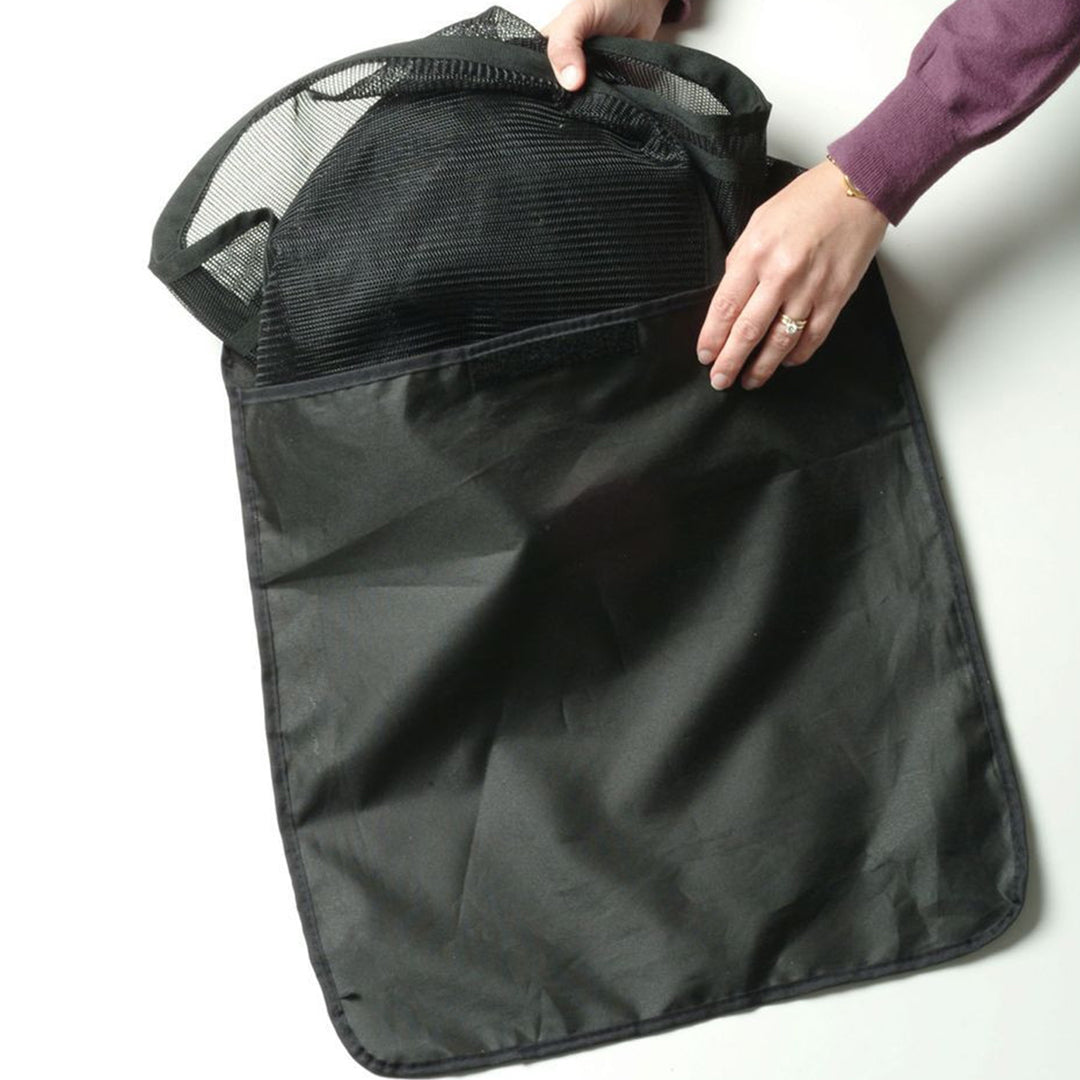 The Front Seat Net Pet Barrier keeps pets from inviting themselves into the front seat area by blocking the space between the front seat and console. The patent pending design uses a see-through micro-mesh material which is guaranteed claw-proof. A popup wire frame keeps the net from sagging and makes it a snap to install/uninstall. The adjustable suspension system allows the Front Seat Net Pet Barrier to fit all vehicles with headrests. Installs in about one minute and includes handy storage pouch.