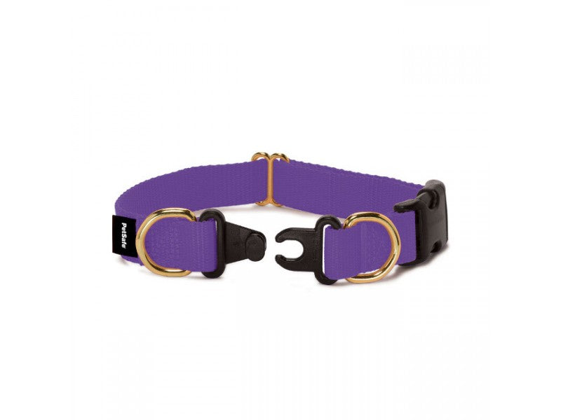 Designed to prevent dogs from getting entangled by their collars, the KeepSafe Break-Away Collar has a patented break-away safety buckle that releases when pressure is applied. The collar hardware has a brass or silver finish.
