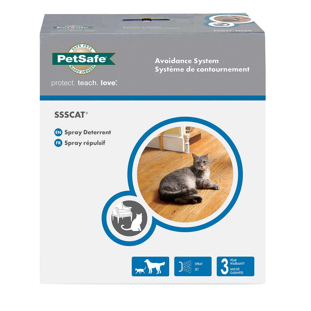 The PetSafe® SSSCAT® Spray Deterrent monitors for movement up to 1 metre away. When your pet is detected, the spray deterrent sends a quick, safe spray that startles your pet. Your pet quickly learns to avoid areas that are off-limits. The spray is odourless and safe and is a sufficient stimulus to deter pets from jumping on kitchen worktops, digging in rubbish bins or entering restricted areas. It is effective for both cats and dogs of all sizes and breeds.