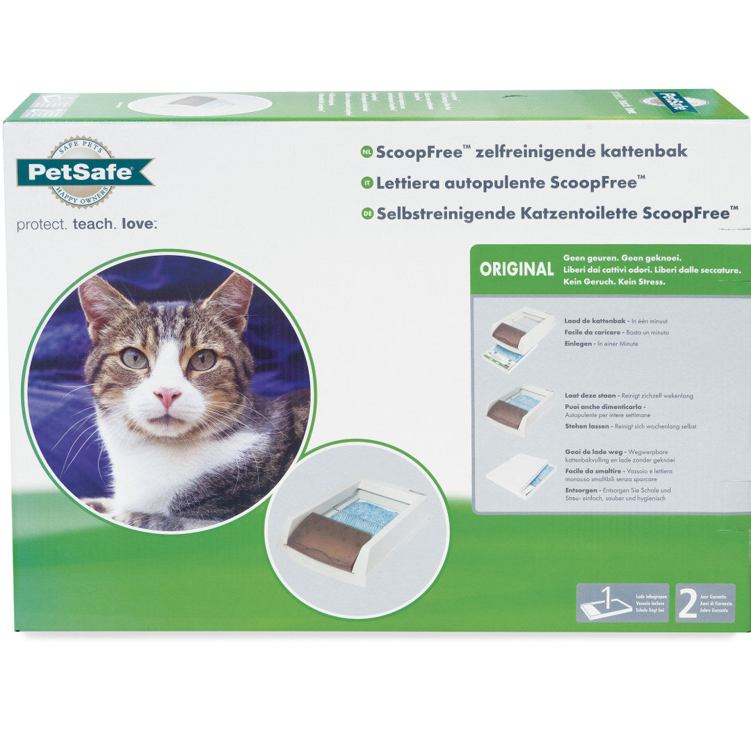 Strike scooping the litter box off your to-do list. With the PetSafe® ScoopFree® Self-Cleaning Litter Box, there’s no scooping, cleaning or refilling your cat’s litter box for weeks. It uses crystal litter which provides 5 times better odor control than traditional clumping litter. Crystal litter absorbs urine and dehydrates solid waste. This low-tracking litter also helps keep your floors clean because it is 99% dust free and doesn’t stick to your cat’s paws. Safety sensors ensure that the scooping cycle only occurs when your cat is out of the box. It uses disposable trays that have a plastic lining to help protect against leaking, and each tray comes with a lid for quick and easy disposal. Just remove the tray and throw it away. Your pet deserves the best. Trust PetSafe® to help keep your pet healthy, safe and happy.