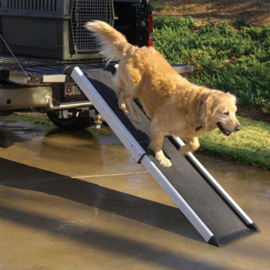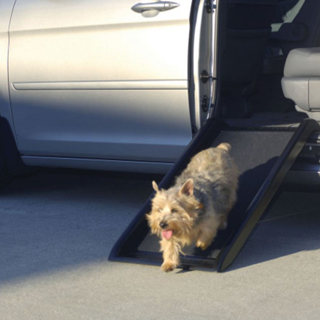 Dog owners know that a lifetime of jumping damages hips, backs and other joints, but until now the selection in pet ramps have always been compromises. Now the Smart Ramp does it all with safety, versatility and ease-of-use. Pets will feel confident on Smart Ramp because it provides secure footing and a superbly rigid frame made just like a tough fibreglass ladder. No slipping, sliding, bounce or sway to scare them off, yet it is still amazingly light at just 7 kg. And Smart Ramp is thoughtfully designed to protect hands, paws and car finishes from scrapes and pinches.