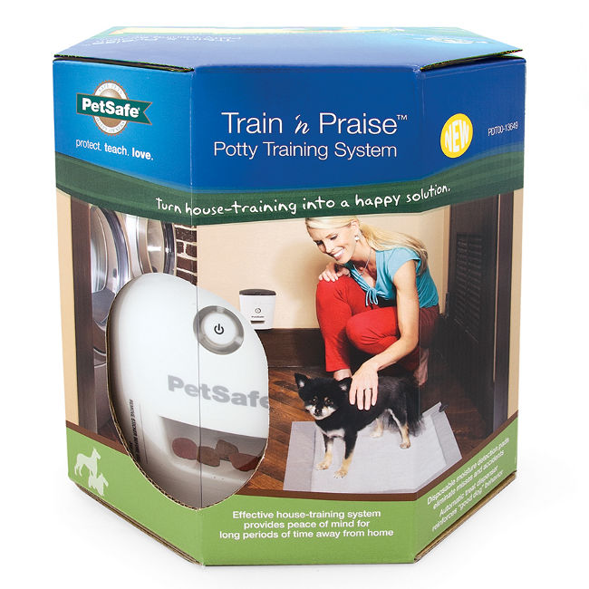 The Train ‘n Praise Potty Training System pairs an absorbent pee pad with a treat dispenser for easy house training and obedience training. This consistent, convenient potty training tool uses treats to encourage good behaviour and allows training to continue while you're away. As your dog pees on the replaceable pee pad, the moisture alerts an internal sensor in the pad, which wirelessly sends a signal to the treat dispenser. The treat dispenser then releases treats or kibble, rewarding your puppy for using the pee pad instead of your floor. Urine is trapped in the leak-proof bottom layer of the pee pad, leaving your floor clean and dry. Young puppies often learn quickly, and even non-housebroken adult dogs or senior dogs who have lost bladder control can easily learn where it's okay to use the bathroom. Once your pup is fully house trained, use the treat dispenser and remote to teach new commands or better behaviour. Teach your dog not to jump or bark at visitors or teach him fun tricks like Sit, Shake, Roll Over and High Five.
